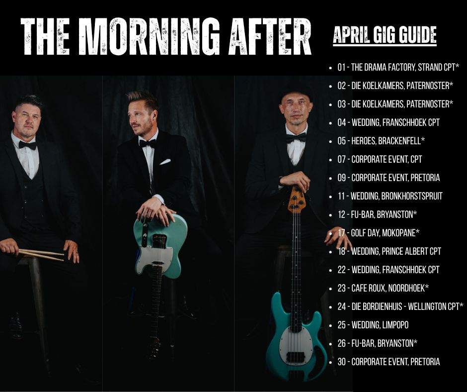 The Morning After is a high-energy party function band consisting of a trio of musos who have been entertaining crowds since 2008. With a focus on weddings, corporate events, festivals and birthday parties these guys travel across South Africa, bringing their infectious energy to every performance.The Morning After is known for their dynamic stage presence, impressive musical skills, and ability to get the party started. If you’re looking for a band that will keep your guests dancing all night long, The Morning After is the perfect choice.